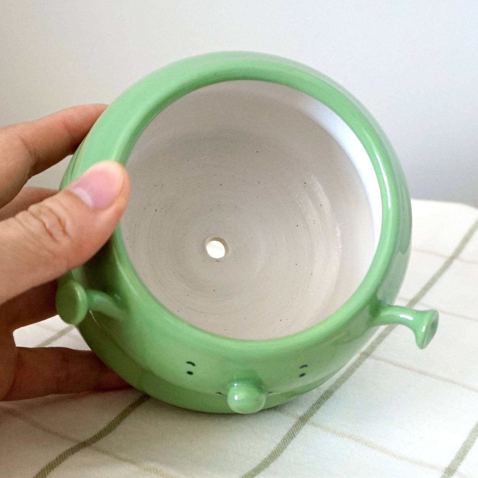 Each piece is completely unique! Nothing is replicated exactly. Pieces are made out of stoneware clay, and fired twice. The inside is fully glazed, ensuring that there is no leakage (unless there is a drainage hole).